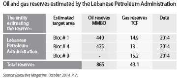 In September 2014, the Lebanese Petroleum Administration estimated the equivalent reserves of blocks 1, 4, and 9 (P50) at 43.2 trillion cubic feet of natural gas and 865 million barrels of oil (Joe Dyke, Jeremy Arbid, 2014).