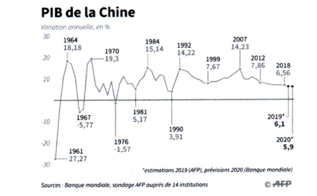 En 2018, le géant chinois commence à montrer des signes d’essoufflement puisque son PIB n’a progressé que de 6,8% soit son taux le plus bas depuis 28 ans. Pékin est menacé par la guerre commerciale lancée par Washington. Les observateurs s’accordent à dire que le géant chinois est devenu en quelques décennies un moteur de croissance mondiale: «Toutefois, si les économies les plus puissantes, comme la France, le Royaume-Uni, l’Allemagne ou les États-Unis, disposent d’un matelas de sécurité et d’une économie diversifiée les rendant moins dépendantes de la Chine, d’autres, comme les pays émergents, sont bien plus inquiètes, et craignent de perdre un allié économique essentiel[29]. Une difficulté qui s’ajouterait à la liste des défis actuels, comme le ralentissement économique mondial, la hausse des taux d’intérêts américains ou encore la baisse des échanges commerciaux ces derniers mois»[30].