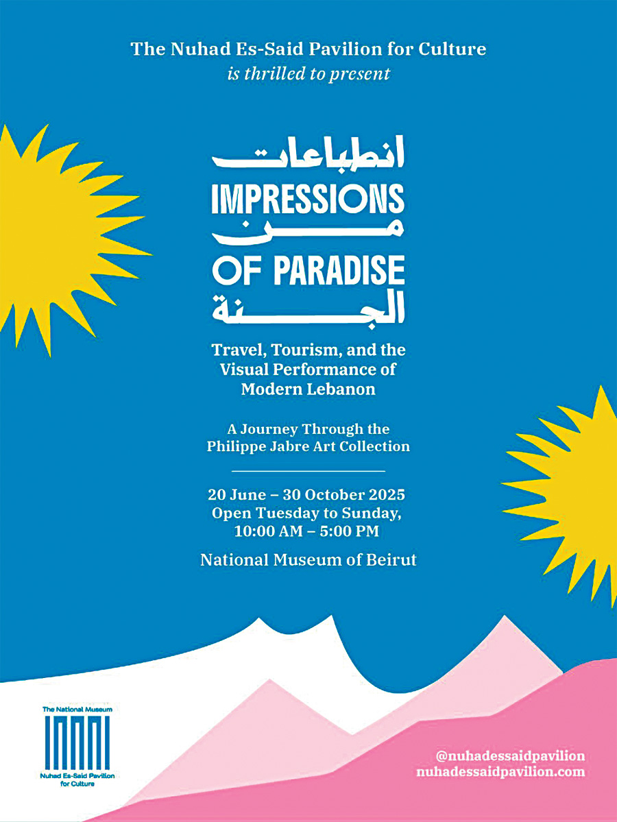 يقدّم معرض ”انطباعات عن الفردوس: السفر والسياحة والأداء البصري للبنان الحديث“ قراءة متأنّية لكيفية تشكّل صورة لبنان، وتسويقها، وتخيّلها بصريًا خلال القرن العشرين. ينطلق المعرض من ملصقات السفر والسينما المحفوظة ضمن مجموعة فيليب جبر الفنية. ويتتبّع عبرها نشوء صورة وطنية جرى تداولها بين عشرينيات القرن الماضي وسبعينياته، والتي قدمت لبنان بوصفه ”فردوسًا“ متوسطيًا يجمع بين العراقة، والترفيه، والانفتاح الكوزموبوليتي.