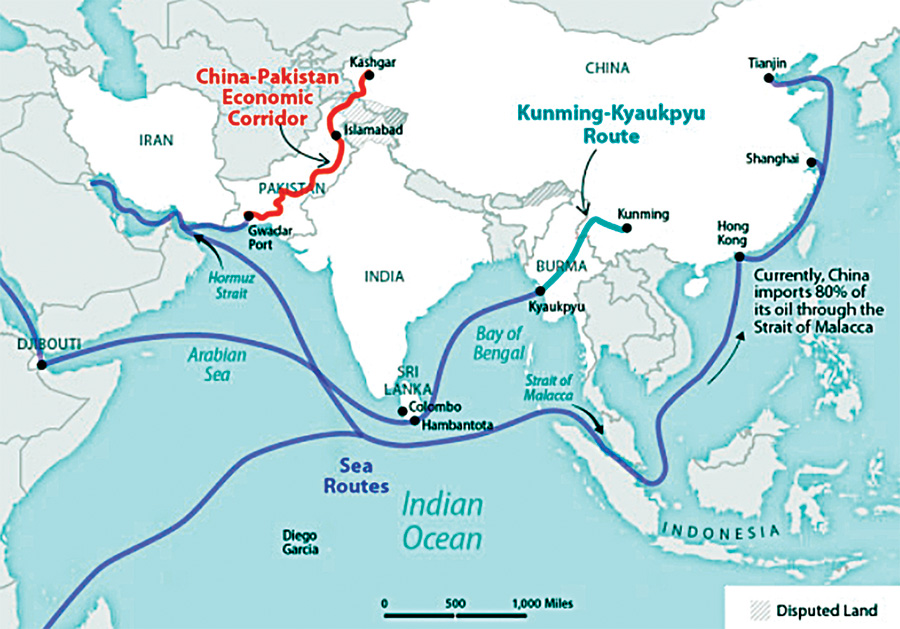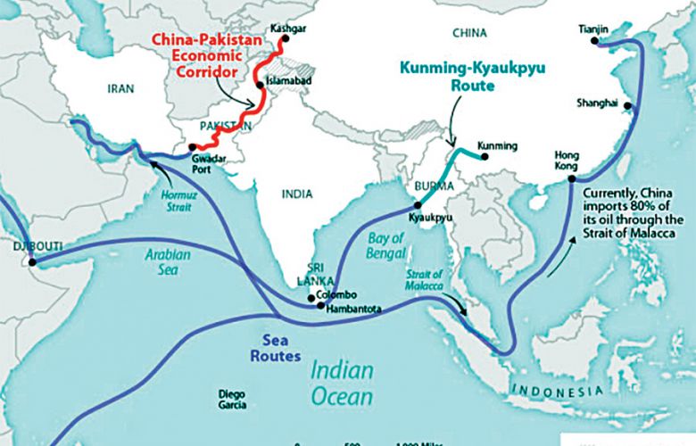 وفي حين يشكّل مضيق ملقا القصبة الهوائية للصين تُسيطر أميركا على هذا المضيق وتستطيع إغلاقه بسهولة. أما إطلالة الصين على المحيط الهادئ فتصطدم بخط الدفاع الأول الأميركي أي تايوان وجزر سينكاكو اليابانية والفيلبين ومن خلفهم جزر أميركية. وبديل ملقا لإطلالتها على المحيط الهندي أقفلته أميركا بالحرب في ميانمار وميناء غوادر في باكستان الذي يتعرض لهجمات طالبان – باكستان بدعم طالبان – أفغانستان.