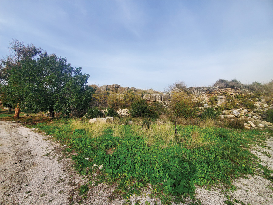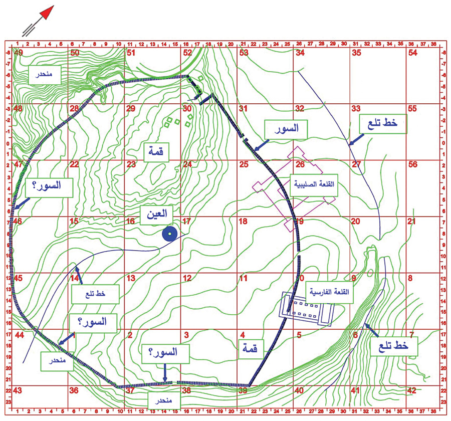 كشفت الحفريات أنّ السور شُيّد من الحجارة الضخمة وأنّ ارتفاعه بلغ في بعض المواضع قرابة أربعة أمتار ونصف، بينما بلغ عرضه نحو مترين. لم يُعثر على أي أثر له في المنحدرات الغربية والجنوبية للمدينة. تشير إحدى الفرضيات إلى أنّ هذه الجهات لم تُسَوَّر، لأنّ انحدارها الحاد شكّل دفاعًا طبيعيًا بحد ذاته. تَعتبر فرضية أخرى أنّ السور ربما كان قائمًا هناك، لكنّ الانهيارات الأرضية المتتالية التي حصلت لاحقًا دمّرته تمامًا.