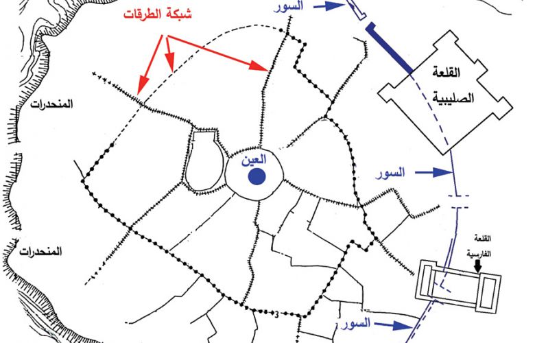 تحولت المساحات الفاصلة بين الأحياء السكنية وحي العين إلى ممرات لحركة السكان وتطورت تدريجًا لتشكّل شوارع المدينة. دلّت الحفريات على وجود قواعد أعمدة متقابلة على جانبي بعض الشوارع. يشير ذلك إلى أنّ أجزاء منها كانت مغطاة، ربما بمظلات خشبية لحماية المارة والبضائع من أشعة الشمس والشتاء، وهو تنظيم يشابه أسواق المدن الشرقية اليوم. كانت الشوارع الأساسية للمدينة تربط بين مختلف أحيائها، إذ كان بإمكان المارة الانتقال عبر بواباتها الأربع إلى الشوارع الواسعة التي تخترق الأحياء السكنية وصولًا إلى الحي المركزي. اتخذت الشوارع نتيجة لذلك شكل مخطط شعاعي، حيث كانت «جميع الطرقات توصل إلى العين».