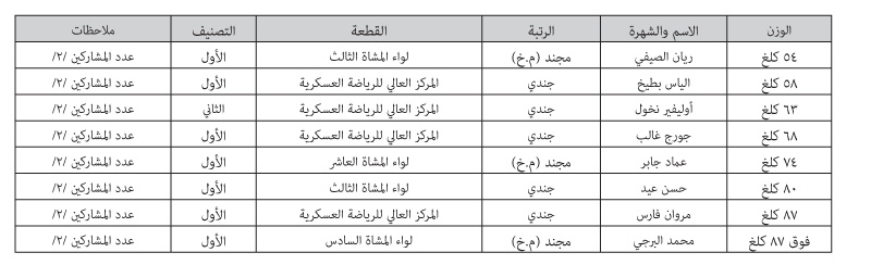 • بتاريخ 10/6/2015، شارك فريق الجيش في لقاءٍ ودّي في التايكواندو من تنظيم دائرة الرياضة في جامعة سيدة اللويزة – ذوق مكايل، وذلك في قاعة التايكواندو في الجامعة المذكورة. وقد جاءت نتائج العسكريين على النحو المبيّن في الجدول أدناه: