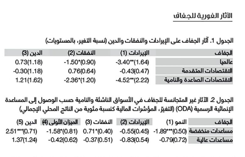 - انخفاض الإيرادات: إذ يؤدّي تآكل القاعدة الضريبية الناتج عن تباطؤ النشاط الاقتصادي وتراجع الإنتاج الزراعي إلى انخفاض الإيرادات الحقيقية بنسبة قد تصل إلى 4.5% في سنة الجفاف، وهو تراجع يفوق نسبة انكماش الناتج المحلي الإجمالي.